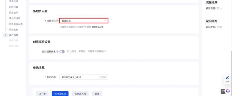 ① 在落地頁設置中選擇所要投放的短劇,根據您選擇的短劇名稱會識別對應的的短劇作者。