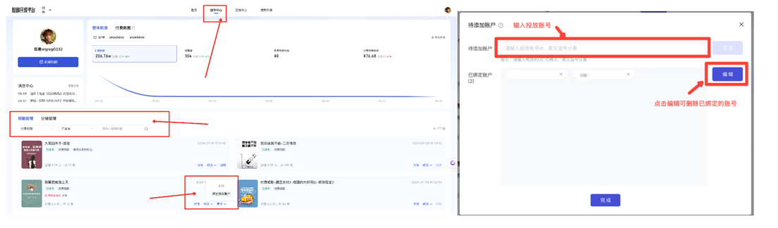 流程:百家號后臺——短劇開放平臺——點擊綁定投放賬戶——輸入需要綁定的投放賬號——點擊添加——賬戶驗證為可投放狀態即可綁定成功