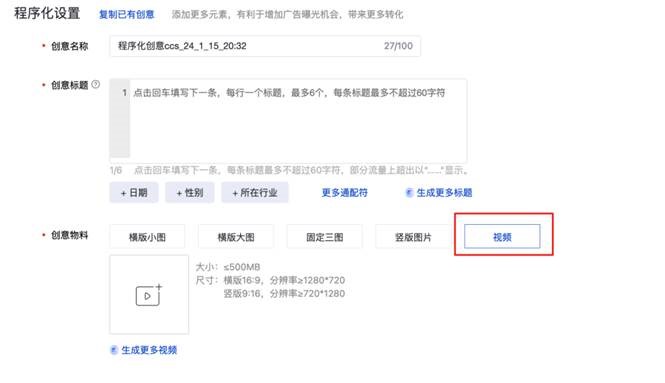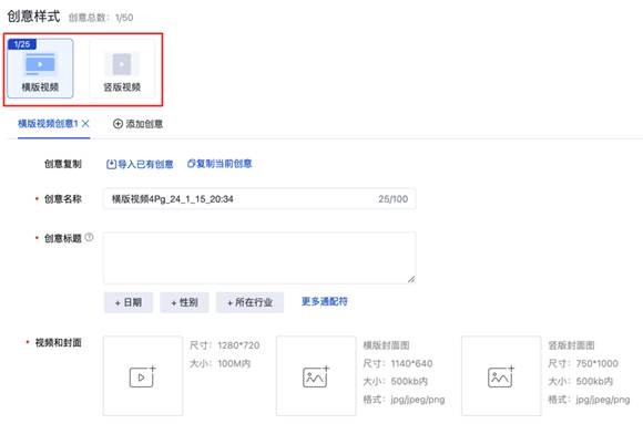 ① 新建自定義創意或程序化視頻創意,程序化創意支持選擇視頻樣式,自定義創意支持選擇橫版視頻和豎版視頻樣式。