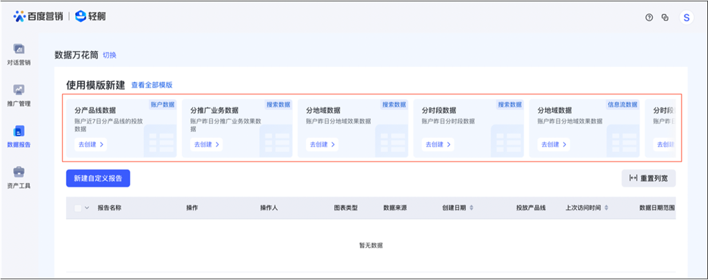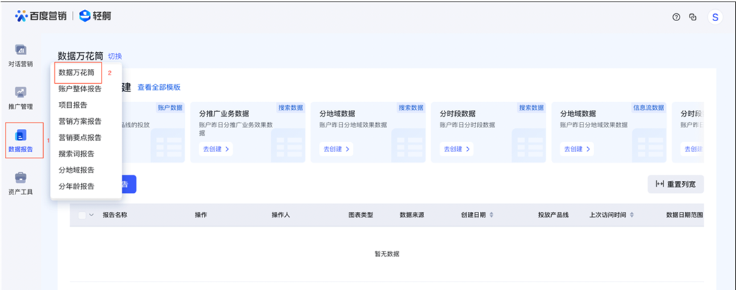 ①數據萬花筒入口:推廣賬號直接登錄,客戶中心管理員需跳轉,進入輕舸平臺-數據報告-數據萬花筒,幫助您獲取不同維度的數據。