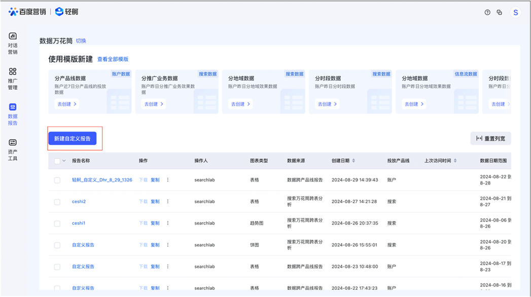 本次輕舸平臺新增「萬花筒」能力,支持廣告主自定義創建數據報告,輕松獲取不同維度的數據,更高效地分析投放效果、洞察優化方向,數據指標篩選項更靈活,常用報表模板更豐富,能夠幫助不同行業、不同分析需求的客戶進行更針對性的數據分析。升級亮點包括: