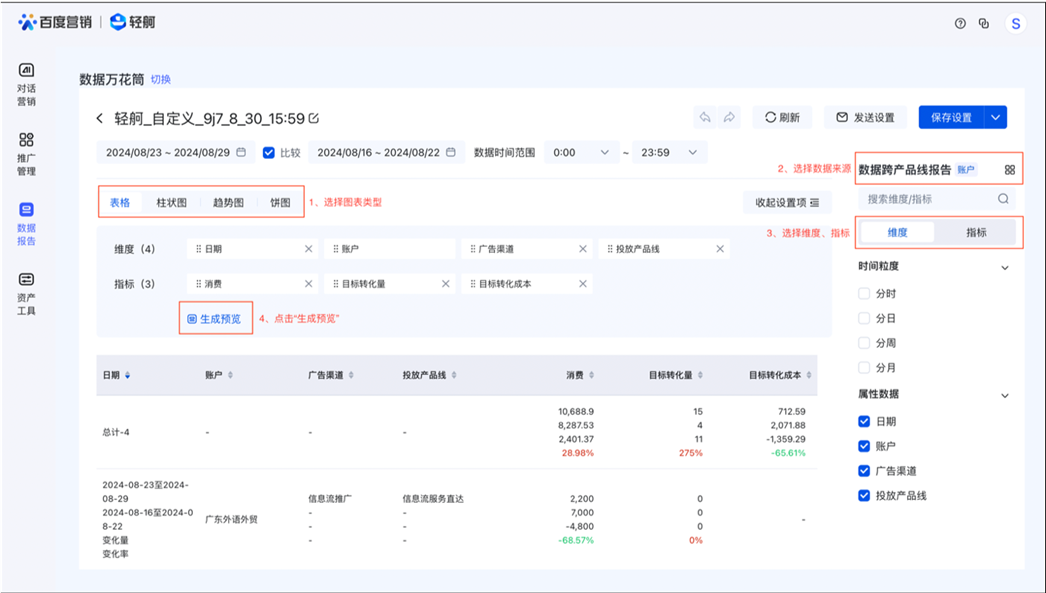 您可以點擊數據萬花筒-新建自定義報告,選擇圖表類型、數據來源、維度、指標后,點擊生成預覽,完成報告的創建。另外,本次數據萬花筒支持生成表格、趨勢圖、柱狀圖、餅圖。
