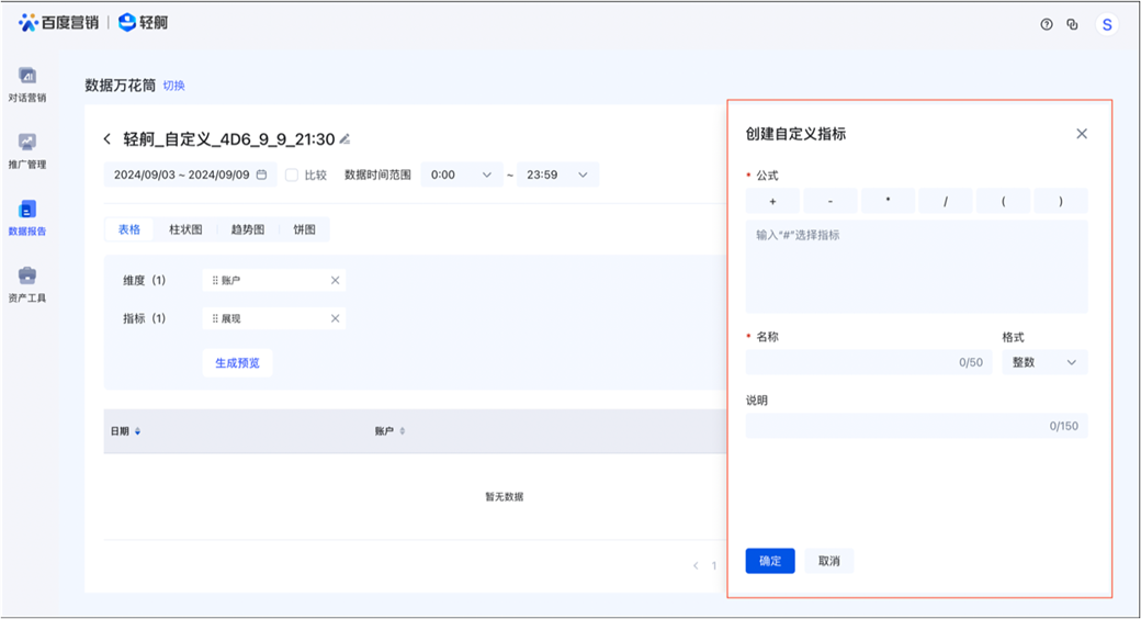 1、更便利的自定義功能,效果一目了然:輕舸數據報告模塊導航首位即為數據萬花筒,方便客戶快速自定義報告,支持自選數據來源、維度、指標,自定義生成指標,生成可視化圖表(柱狀圖、餅圖、趨勢圖等);支持按推廣業務維度聚合分析數據;可查看搜索推廣、信息流推廣、愛采購、服務直達等全產品線投放數據無需跨多個平臺獲取數據;各維度均支持獨立聚合,方便客戶更全面地根據自身需要,了解關鍵指標變化。如果有特殊指標不在指標明細中您還可自定義指標;
