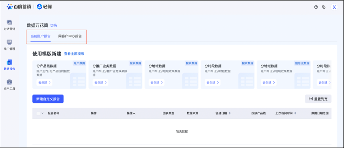 ①客戶中心的超級管理員,可在輕舸平臺-數據報告-數據萬花筒中使用萬花筒能力,支持您按照當前賬戶/同客戶中心查看;