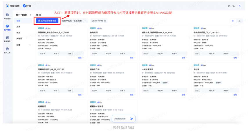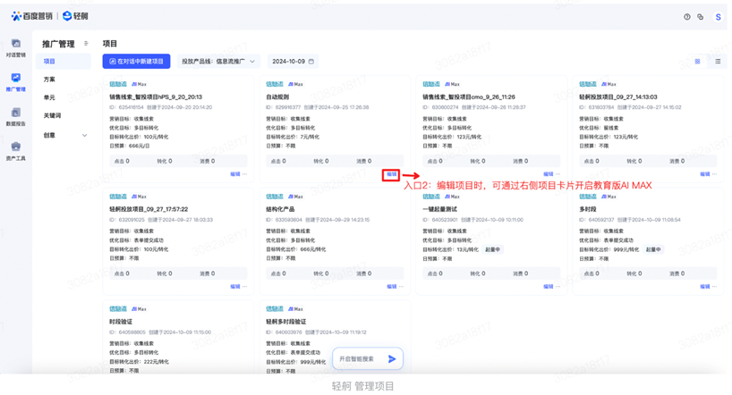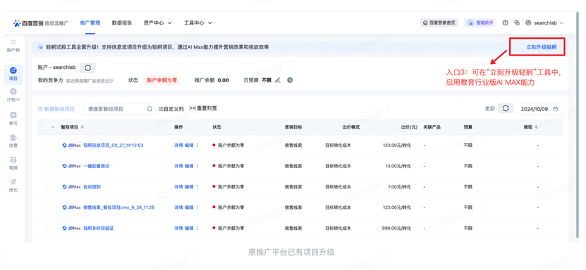 ③可選原信息流推廣平臺已創建的項目,通過「立刻升級輕舸」能力,啟用教育特別版AI Max能力,并成為升級版項目;