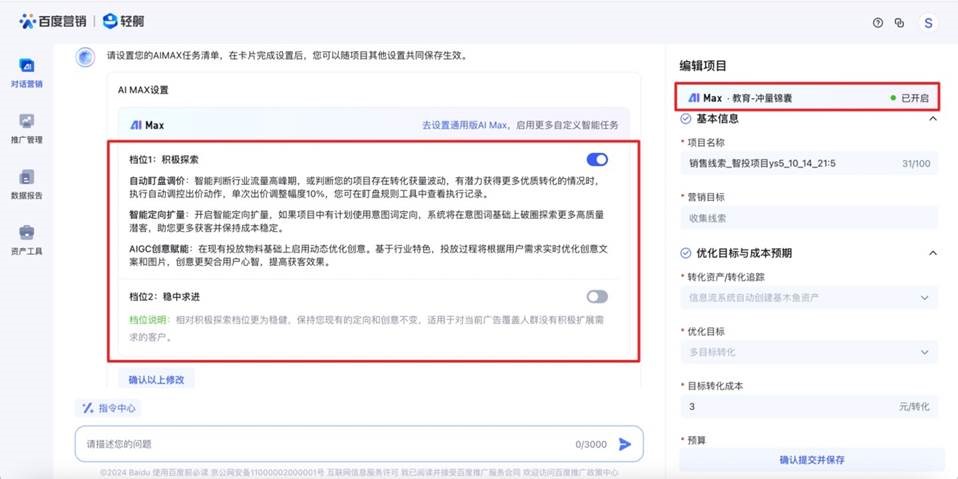 百度輕舸投放平臺,用生成式AI技術重構了營銷投放,24年9月輕舸平臺為信息流推廣正式推出“AI Max”的新一代智能投放模式,運用百度生成式AI領先的大模型分析、推理和決策,賦能客戶統籌構建統一的長周期智能投放項目,更穩成本、更少操作,讓AI幫助客戶實現投放效果的最大化(詳見產品動態「新增“AI MAX”的新一代智能投放模式,幫助客戶實現效果最大化——全流量上線」)