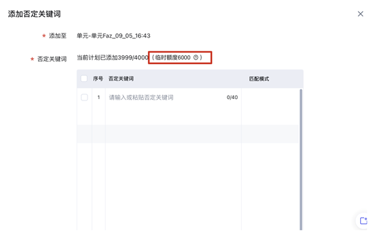 2、臨時否詞配額:若您的某計劃否詞數量超過客戶星級權益否詞配額,系統將暫時基于您清理重復否詞后的否詞數量、按1000向上取整為臨時否詞配額(例如清理重復否詞數后為3800,則臨時否詞配額為4000),臨時額度有效期截止至2025年6月,在此之前,您可以在此否詞配額內正常添加/刪除否詞。新計劃的否詞數量按客戶權益正常生效。