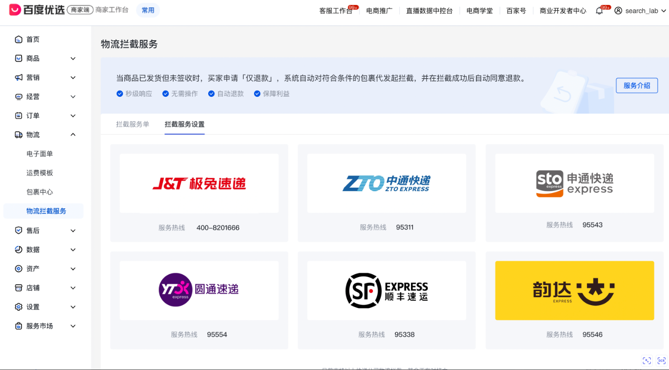 商家可在【商家后臺】-【物流】-【物流攔截服務】模塊查看攔截服務商和攔截服務單明細數據。