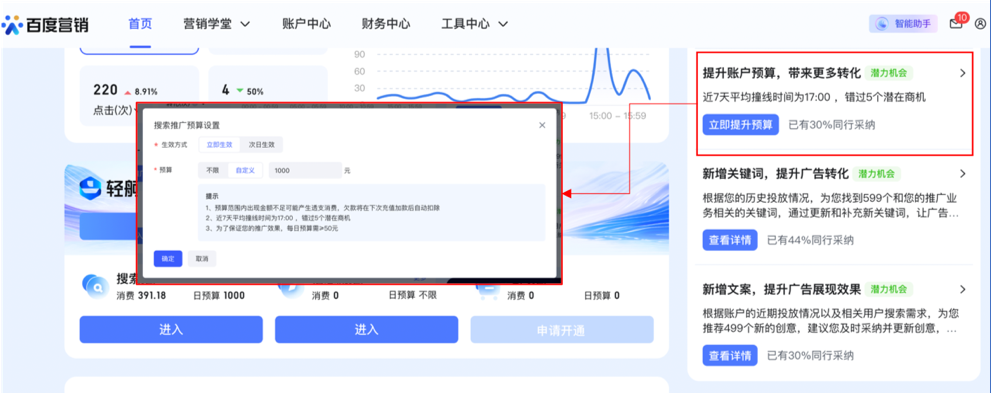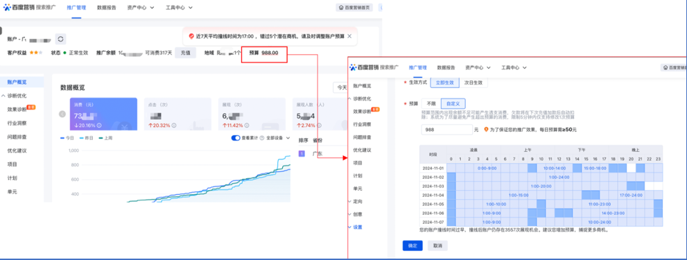 您可通過搜索推廣投放平臺(tái)首頁->賬戶預(yù)算板塊,查詢過去X天的賬戶撞線時(shí)間點(diǎn)和未覆蓋流量時(shí)段,點(diǎn)擊預(yù)算內(nèi)容后可直接調(diào)整賬戶預(yù)算,延長投放時(shí)間或減少異常撞線情況發(fā)生。