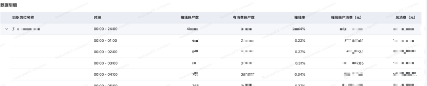 注意:撞線賬戶數(shù)、賬戶撞線率、撞線賬戶消費(fèi)等分時(shí)數(shù)據(jù)為0點(diǎn)開始的累計(jì)值,有消費(fèi)的賬戶數(shù)和總消費(fèi)為當(dāng)天的總和固定值用于參考