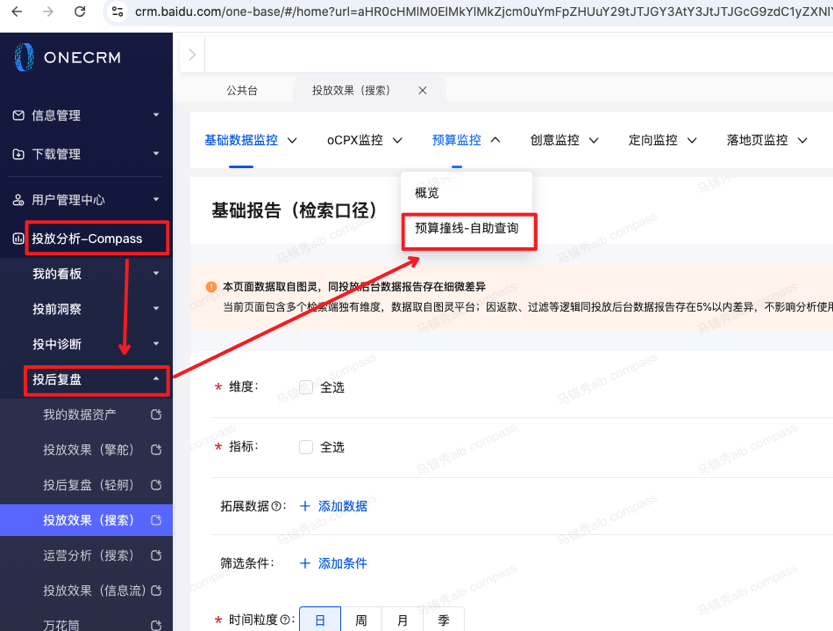 數(shù)據(jù)獲取方法:CRM賬戶登錄onecrm—>投放分析-compass—>投后復(fù)盤—>投放效果-搜索—>預(yù)算監(jiān)控—>「預(yù)算撞線-自助查詢」