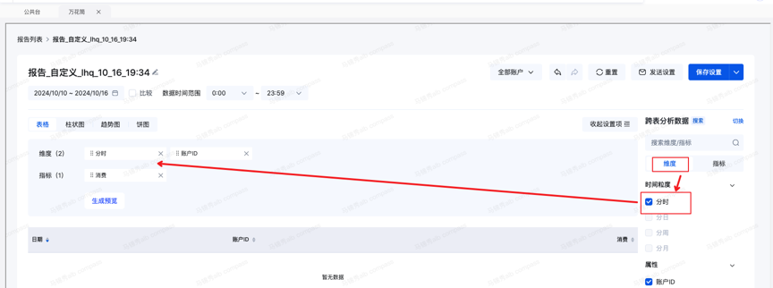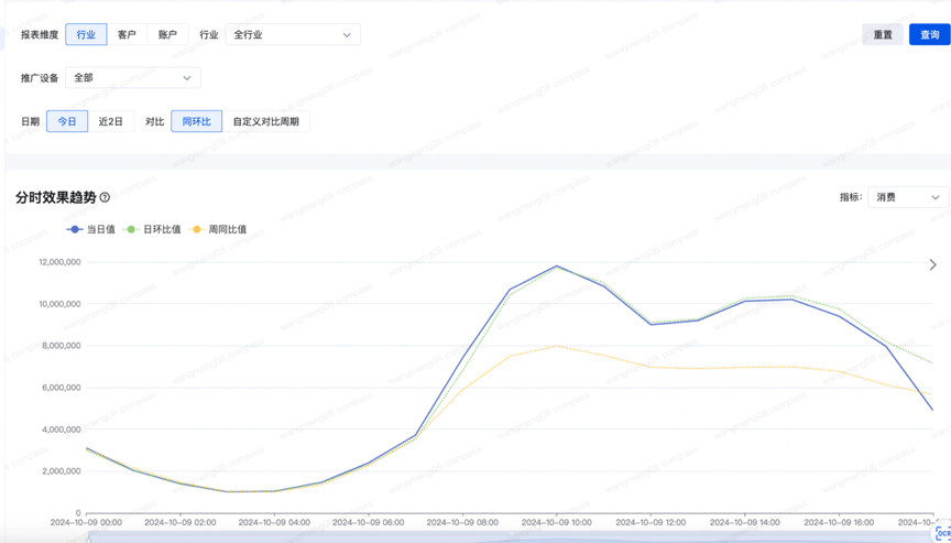 超管賬戶登錄客戶中心—>數(shù)據(jù)報(bào)告—>萬花筒—>維度選擇分時(shí)疊加消費(fèi)指標(biāo)
