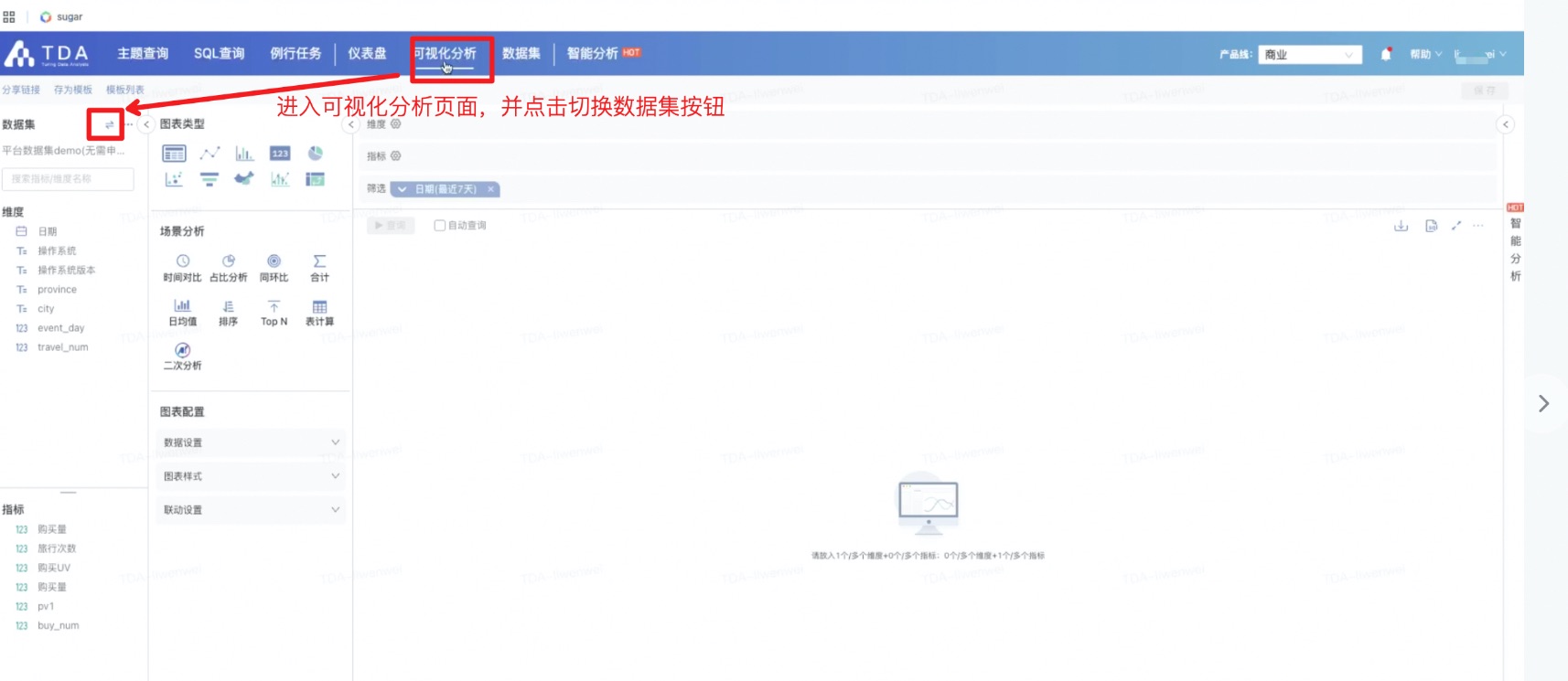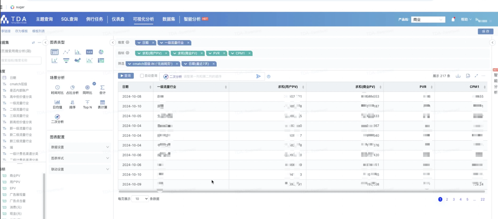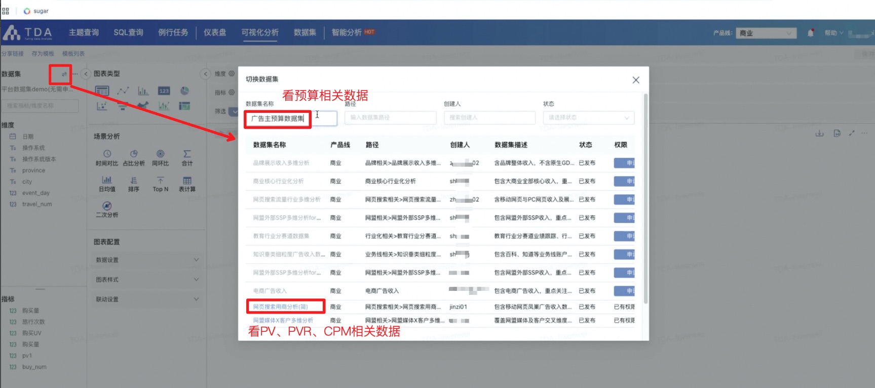 使用路徑說明:進(jìn)入TDA平臺(tái)->可視化分析->切換數(shù)據(jù)集->找到所需數(shù)據(jù)集(預(yù)算相關(guān)數(shù)據(jù)集名稱:廣告主預(yù)算數(shù)據(jù)集;流量、PVR、CPM1相關(guān)數(shù)據(jù)集名稱:網(wǎng)頁搜索用商分析(簡))->自定義拖拽所需維度和指標(biāo)數(shù)據(jù)值至右側(cè)預(yù)覽區(qū)->點(diǎn)擊查詢按鈕即可,支持明細(xì)數(shù)據(jù)下載