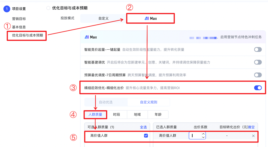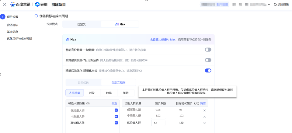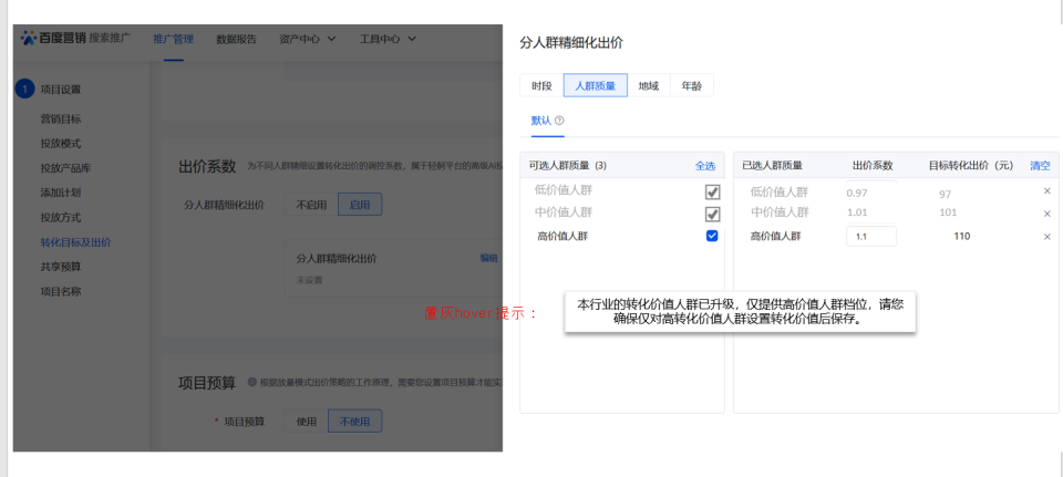 b.保存項目:清理掉中/低質量人群的出價系數后,項目才能整體保存成功,否則將無法保存