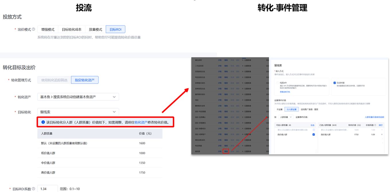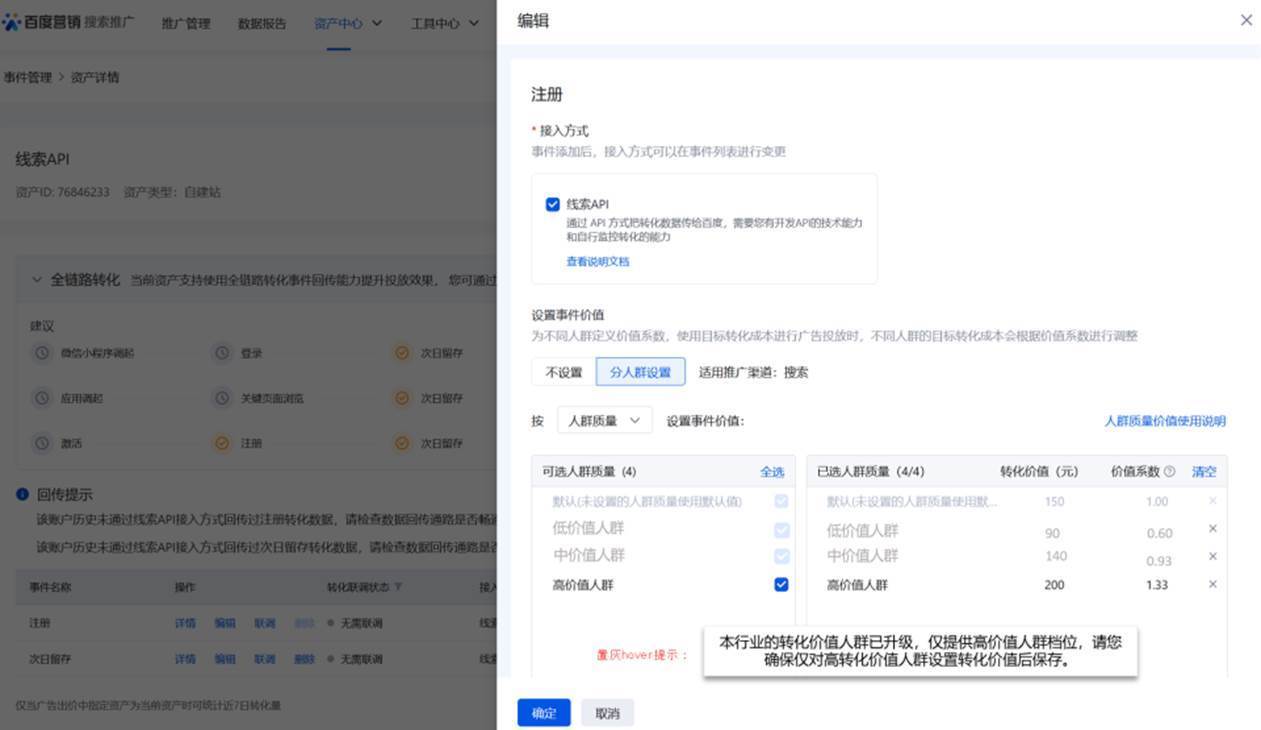 不修改的轉化資產:在現有轉化資產的精細化出價未作修改時,人群策略和分檔位價值設置都不會改變。需修改的轉化資產:進入轉化資產-轉化事件的編輯頁面進行修改時,中/低質量人群轉化價值將失效: