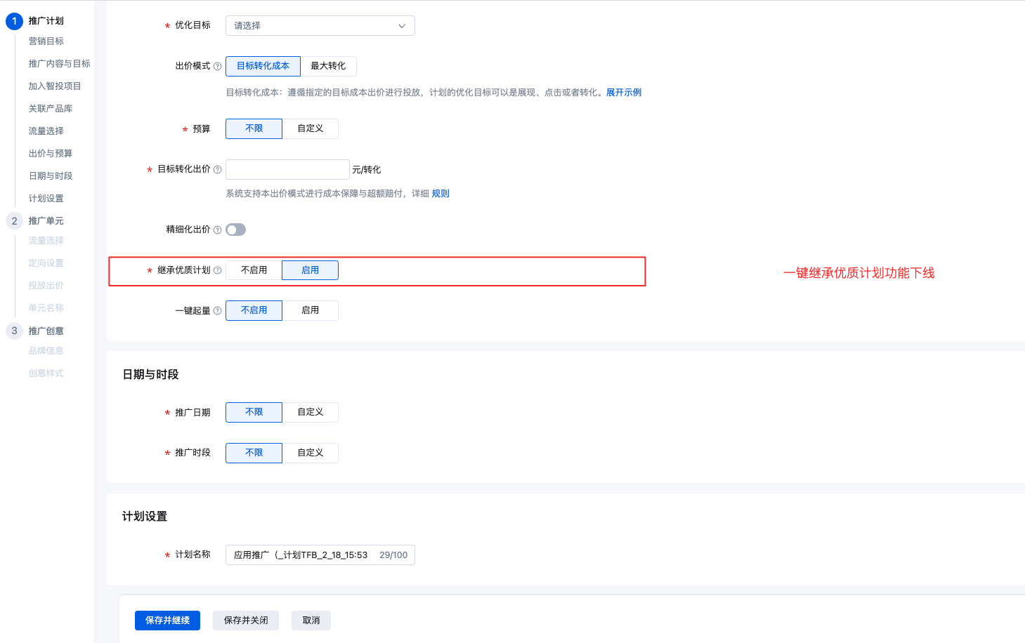 A1:保留。一鍵繼承功能下線后,歷史存量的數(shù)據(jù)依然保留一鍵繼承功能,只是前端頁(yè)面不再展示該配置項(xiàng)。新建的計(jì)劃自動(dòng)升級(jí)為系統(tǒng)優(yōu)選。