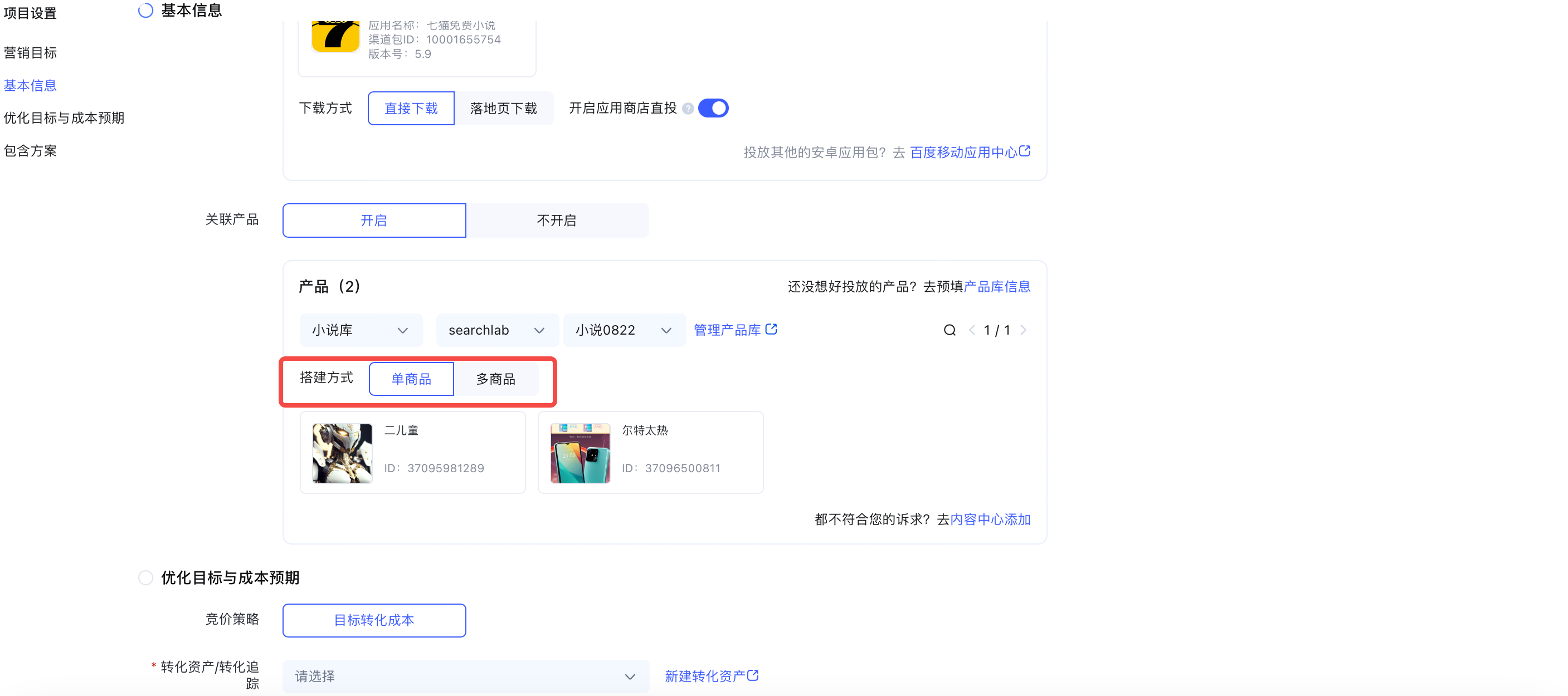 a.單商品場景:(此前已支持):當(dāng)用戶選擇關(guān)聯(lián)單商品的時候,可以按照原來的模式,在側(cè)拉框選擇單商品進行投放。