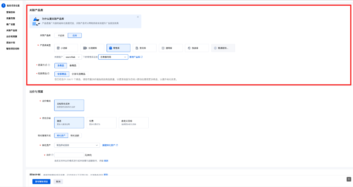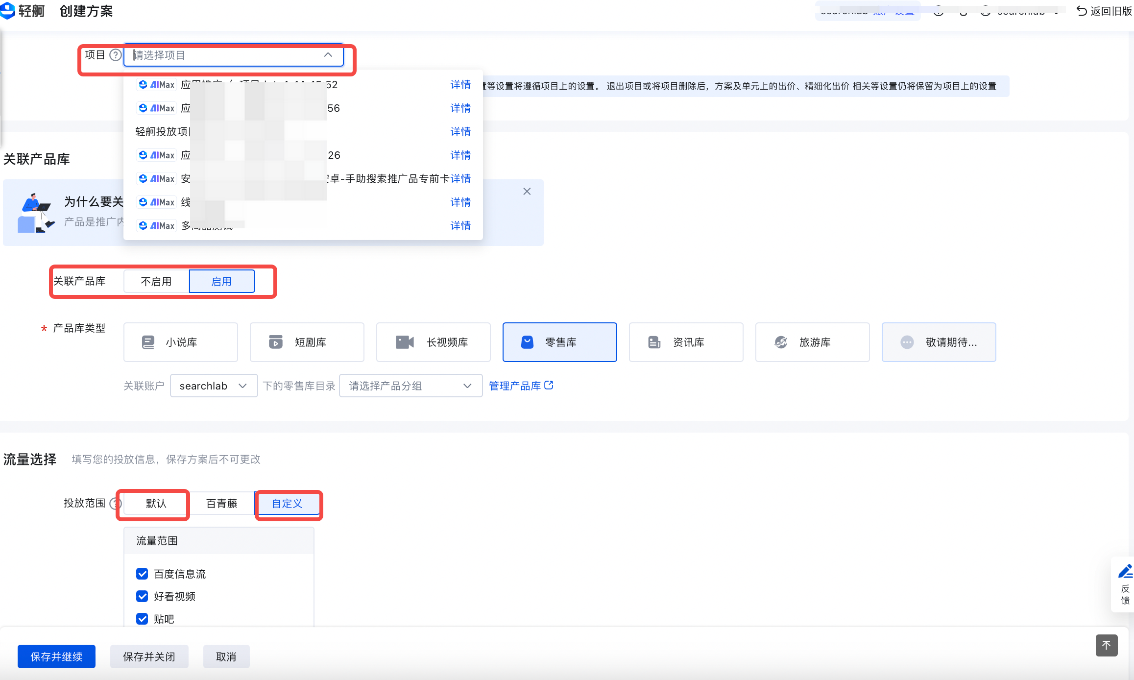 當(dāng)用戶手動選擇計劃的“默認”或者“自定義”的流量范圍時,可選擇的加入項目會自動過濾為非百青藤關(guān)聯(lián)多商品的項目。