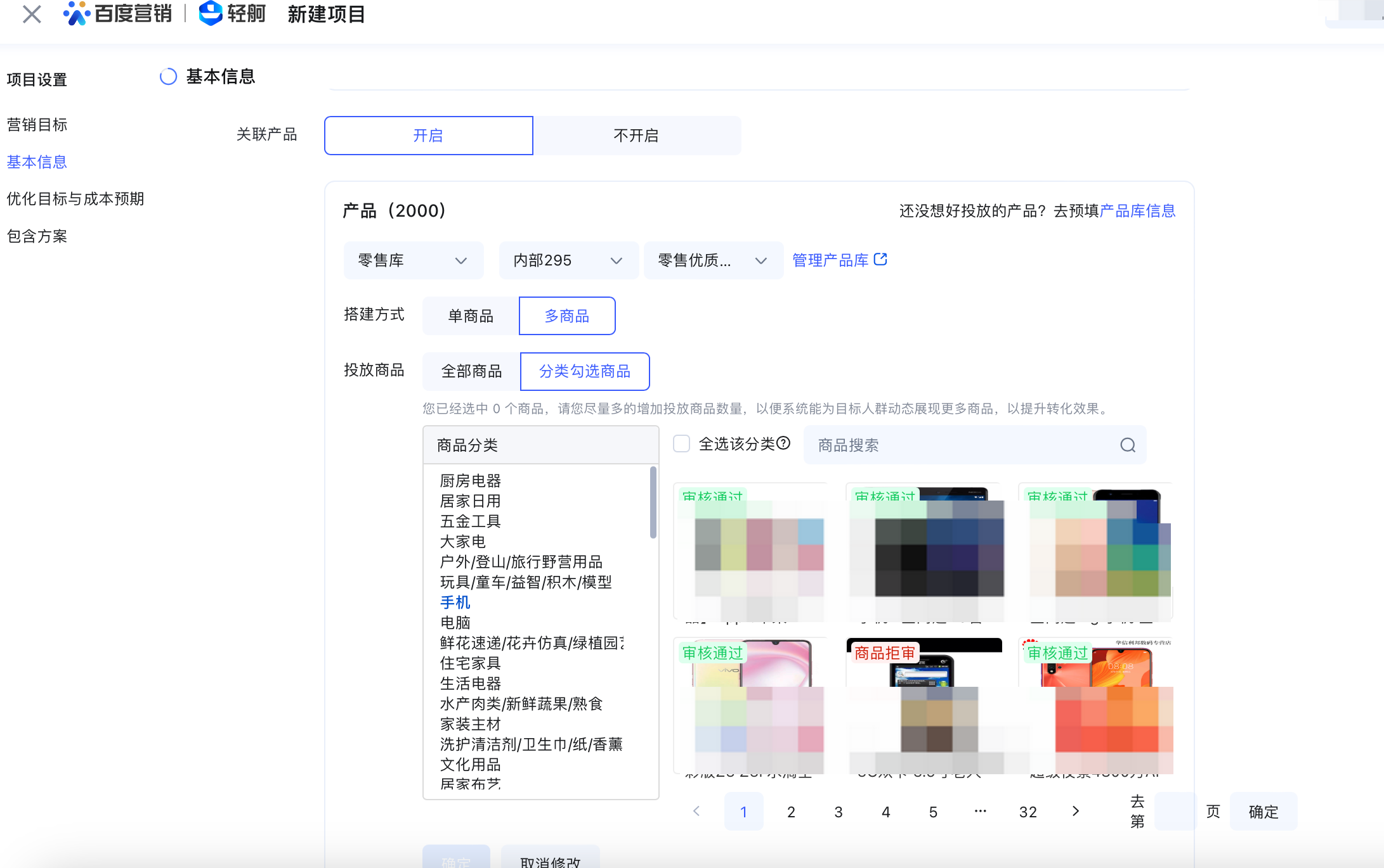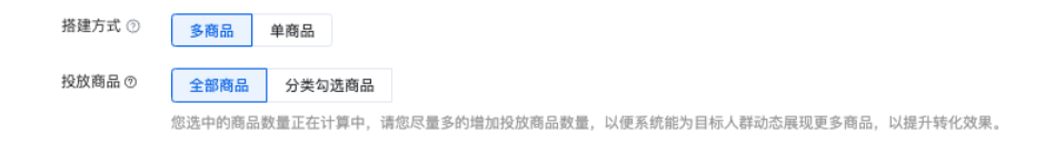 b.多商品場景:當(dāng)用戶選擇關(guān)聯(lián)多商品的時候,可以選擇全部商品、或者分類勾選商品進行多商品投放。