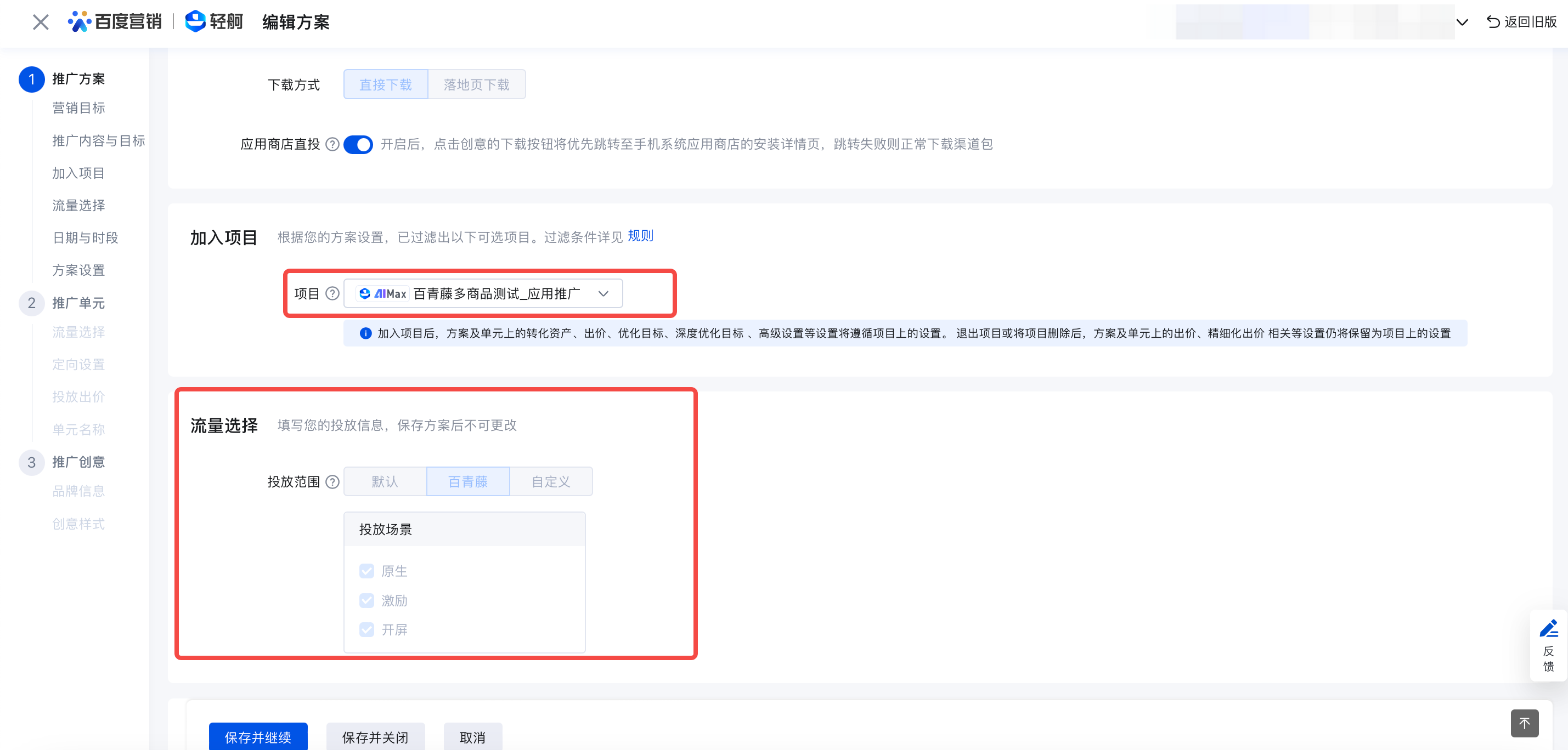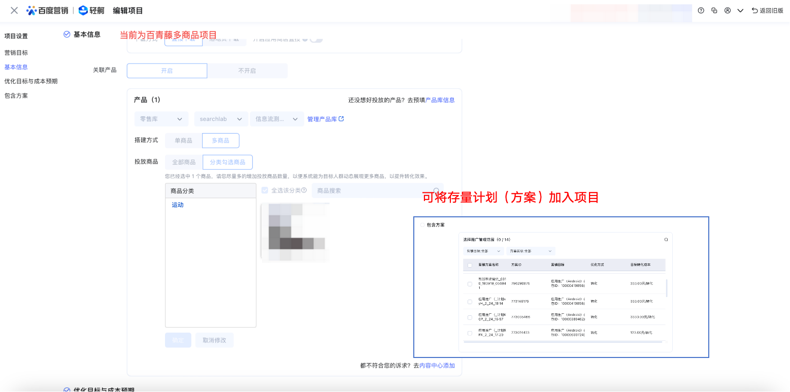 針對已加入百青藤關(guān)聯(lián)多商品項目的計劃,用戶可修改加入其他項目,但是計劃的“投放范圍”默認無法修改,依然為百青藤。
