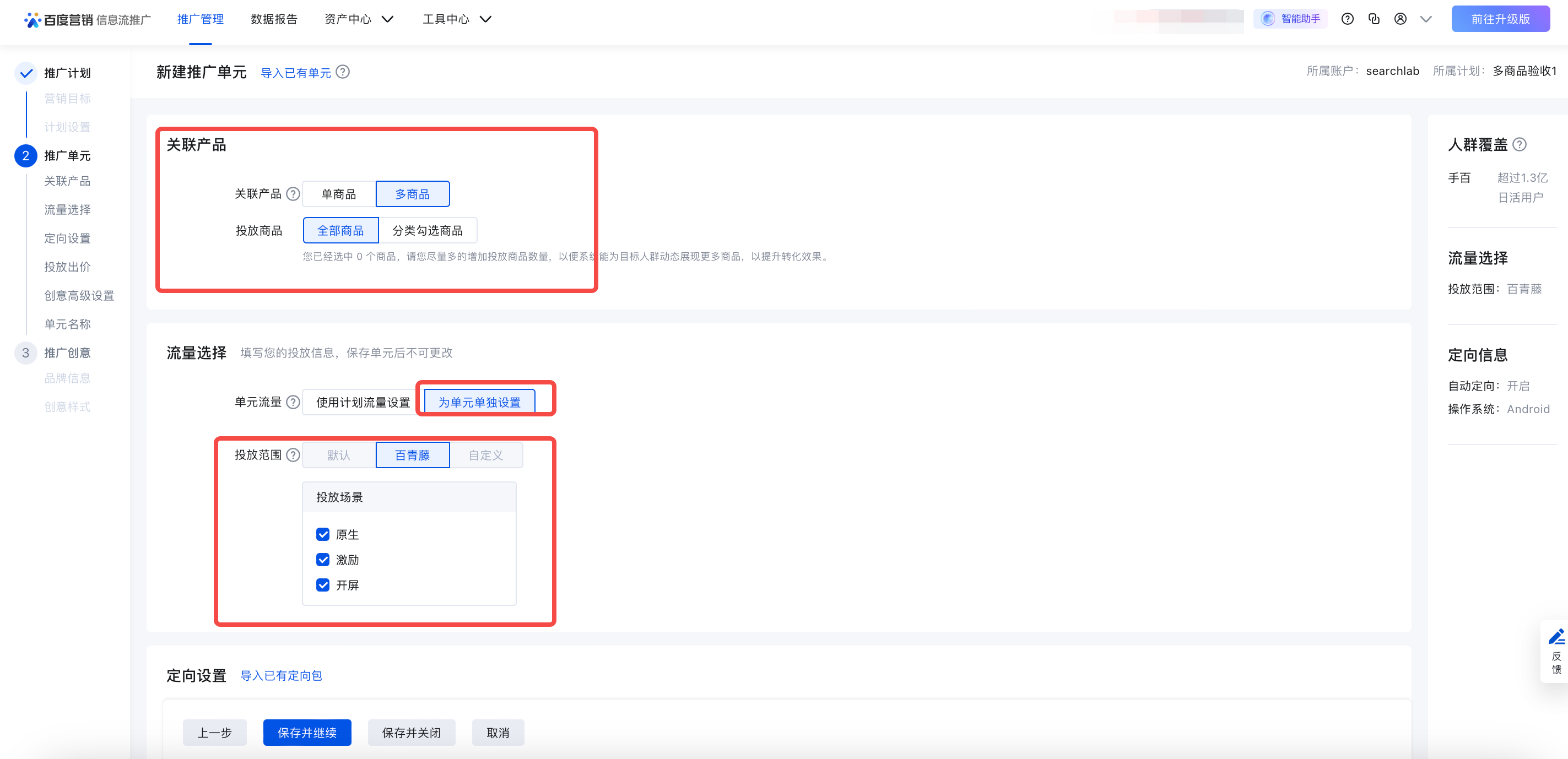 ③單元層級:單元層級支持選擇多商品,同時創(chuàng)意高級設(shè)置支持自動創(chuàng)意優(yōu)化(詳見下方:主要升級點2)。