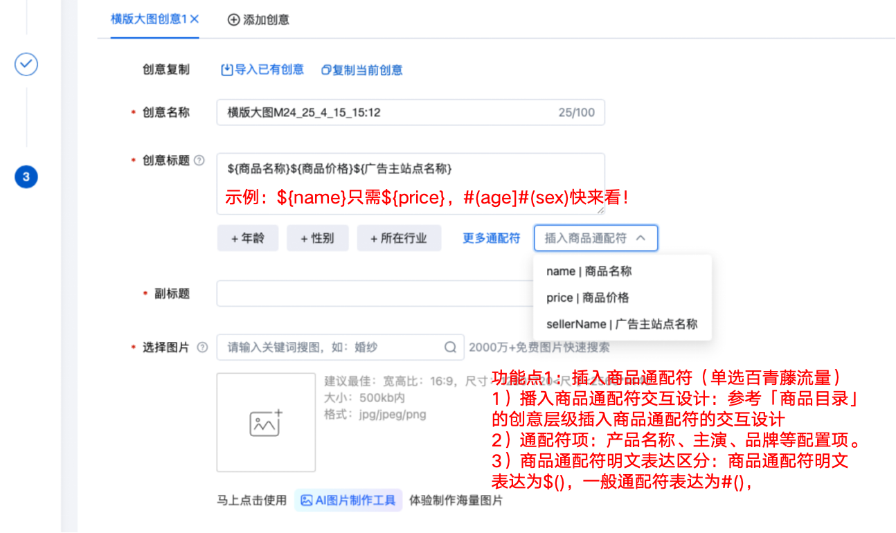 ④創(chuàng)意層級,創(chuàng)意標(biāo)題新增支持插入電商和長視頻的商品通配符。