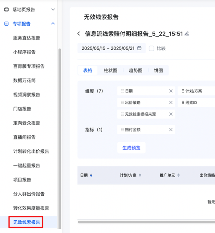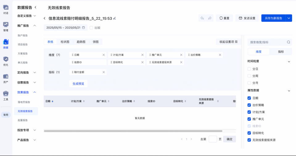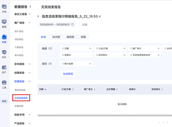 升級投放平臺數據報告,為信息流推廣新增無效線索報告,披露「無效線索報告-線索賠付明細」。