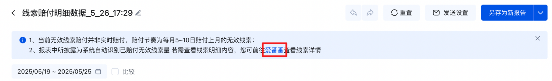①數據范圍&查看方式:廣告主通過愛番番等工具跟進線索并提報無效線索后,經系統確認并賠付的線索明細將在此披露,其數據明細中的賠付金額對齊財務系統。