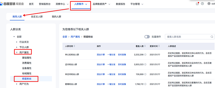 1、人群集市-推薦人群:新增270個明星粉絲場景人群,新增80個招商加盟和16個家具行業(yè)主題人群,新增3個汽車搖號人群。