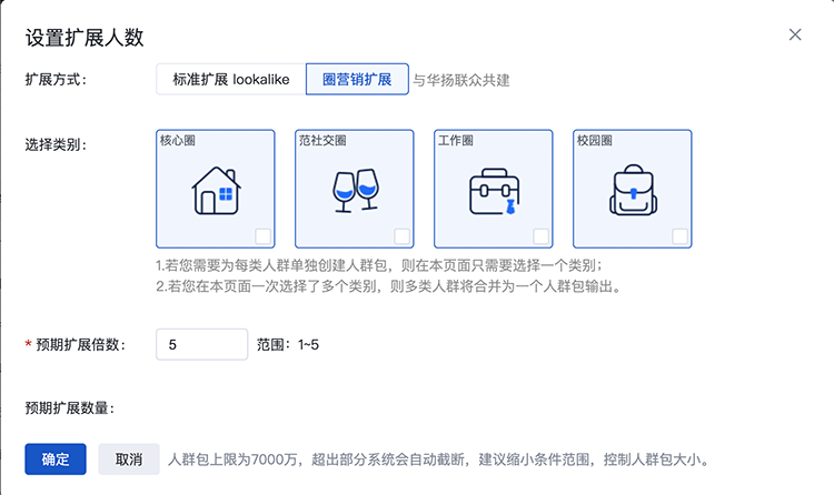 ü 擴(kuò)展人群包上限為7000萬,超出部分系統(tǒng)會自動截?cái)?,建議縮小條件范圍,控制人群包大小。