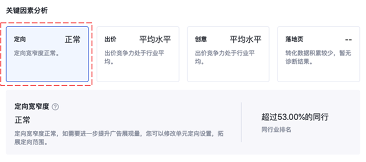 定向:提供單元定向效果的分析與結論,披露定向寬窄度,支持查看當前單元的定向在同行業的排名。