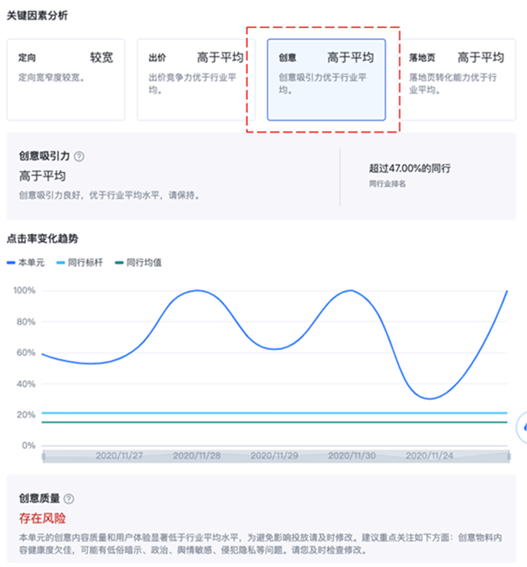 創意獲取點擊能力是單元點擊效果指標,通過絕對值及同行業排名,定位單元點擊率表現情況;創意質量是對當前單元所投放的創意素材質量、用戶體驗進行綜合分析評估的指標,分析結論反映最近該單元的創意質量在百度系媒體投放時的綜合表現)