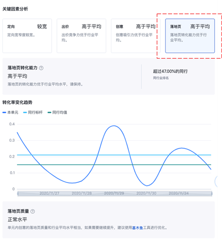 落地頁:落地頁分析與結論,披露落地頁轉化獲取能力,支持同行標桿、同行均值對比趨勢圖(落地頁獲取轉化能力是該單元落地頁轉化效果指標,通過絕對值及同行業排名,定位轉化率表現情況;落地頁質量是對當前單元所投放的落地頁素材質量、用戶體驗進行綜合分析評估的指標,分析結論反映最近該單元的落地頁質量在百度系媒體投放時的綜合表現)