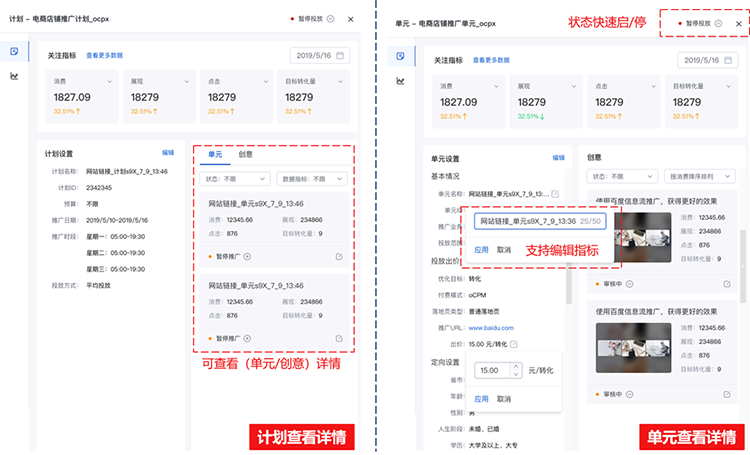 查看詳情內設置的計劃/單元基礎信息,與推廣管理物料列表、主流程內進行的操作一致