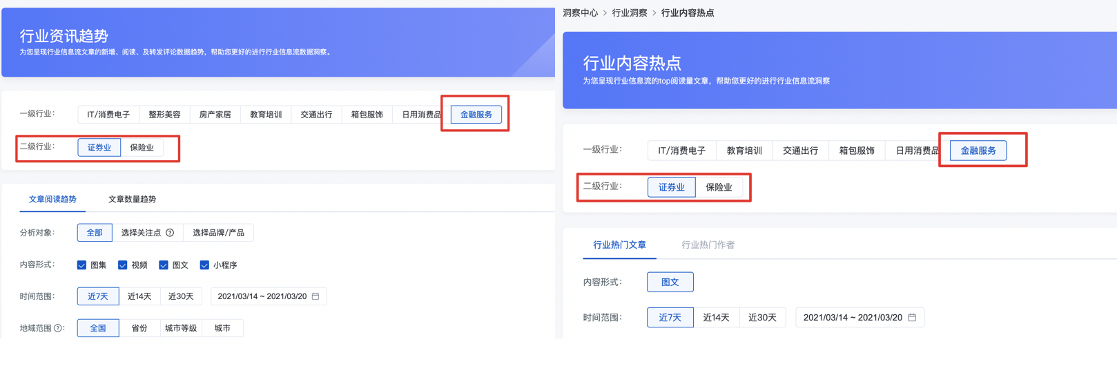 1、洞察中心-行業(yè)資訊趨勢(shì)&行業(yè)資訊熱點(diǎn):新增金融服務(wù)-保險(xiǎn)、金融服務(wù)-證券業(yè)2個(gè)行業(yè),幫助用戶(hù)更好的應(yīng)用行業(yè)內(nèi)文章的瀏覽及top文章內(nèi)容熱點(diǎn)等多維度信息流數(shù)據(jù)的洞察,了解行業(yè)的整體資訊趨勢(shì)。