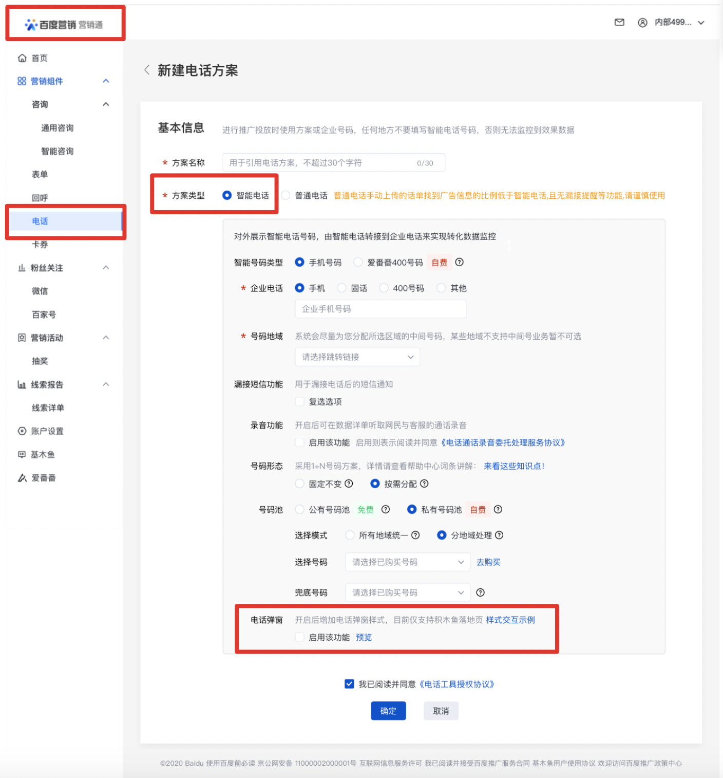 為幫助客戶打造專業、真實的企業形象,提高網民對智能電話的信任度,營銷通智能電話支持號碼保護彈窗,告知網民將要撥打的電話為百度平臺為此次通話分配的中間號碼,以此增進網民信任感,提升撥打意愿。