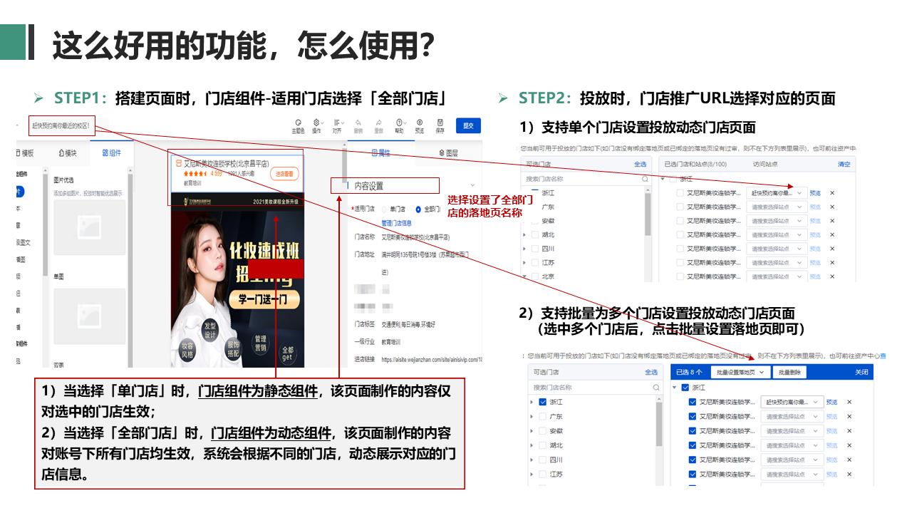 A2:如果您有多個門店,但是每個門店單頁中除了門店信息不同其他內(nèi)容都相同時,建議門店組件選擇「全部門店」,則只需要建一個門店單頁模板即可滿足您的推廣訴求,大幅提高建落地頁的效率。
