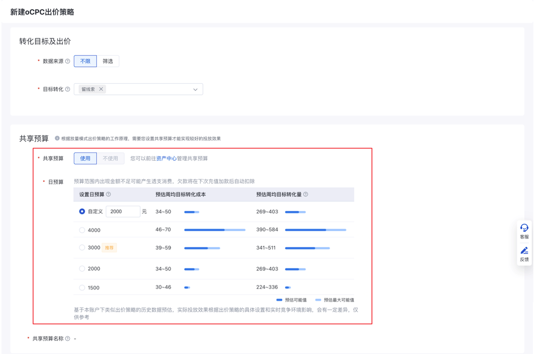 放量模式出價策略提供“共享預算”下轉化量預估及預算設置建議——小流量上線